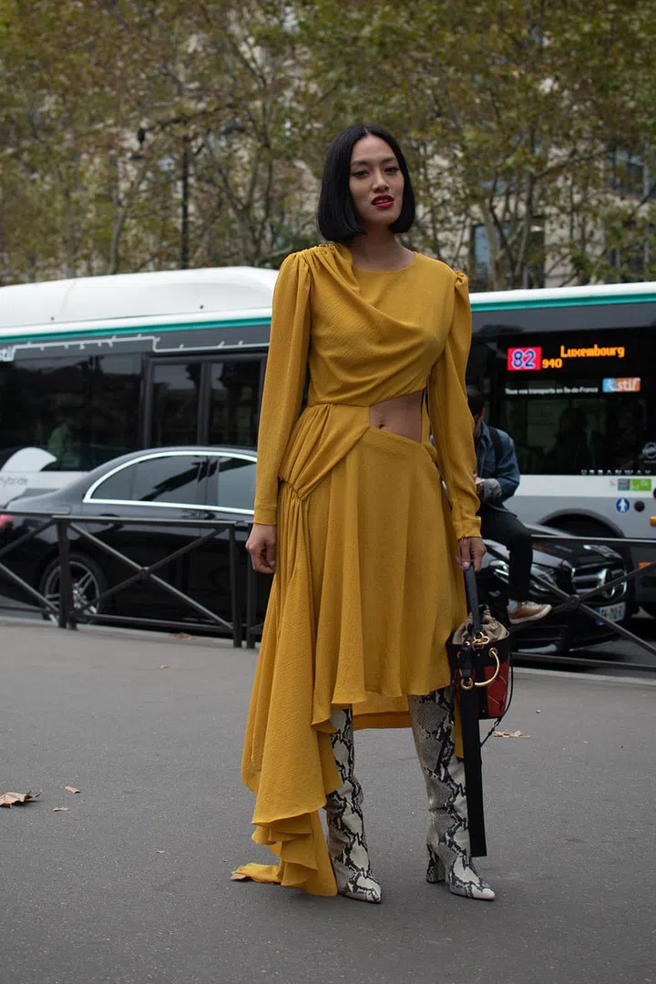 If we opt for bright colours or loud prints, it's easy to feel you have to mute your footwear. This stylish fashion show attendee shows us that's not the way - you can ramp up your ensemble to the next level of cool with the right shoes (or boots, in this case).