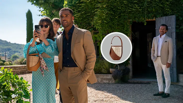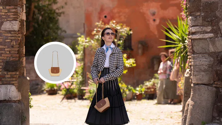 Yet another versatile piece to add to your collection, Emily wears the Mini Manon in Raffia from Saint Laurent in the last episode of Emily in Paris, that doubles as a shoulder bag and a crossbody.