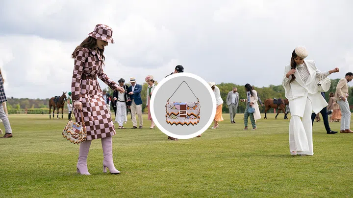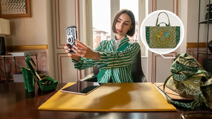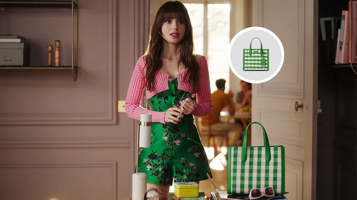 In the first episode of Emily in Paris, Emily makes an entrance with a striking gingham tote from Kate Spade. While the bag’s bold print creates a playful clash with her co-ords, the coordinating green tones pull the look together.