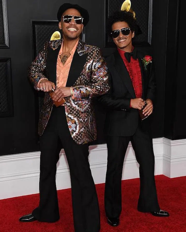 Bruno Mars and Anderson Paak went full seventies style in Gucci debuting their duo Silk Sonic and performing their hit "Leave The Door Open" during the show
