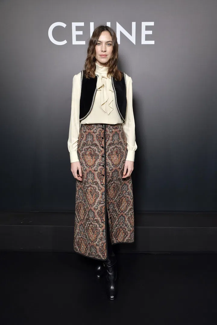 Chung’s outfit is all about monochrome with a splash of fun. At Celine’s FW ’20 show, the co-host of Netflix’s design competition show, Next in Fashion (2020), wore an ecru blouse, a short black velvet vest and a baroque printed quilted skirt.
