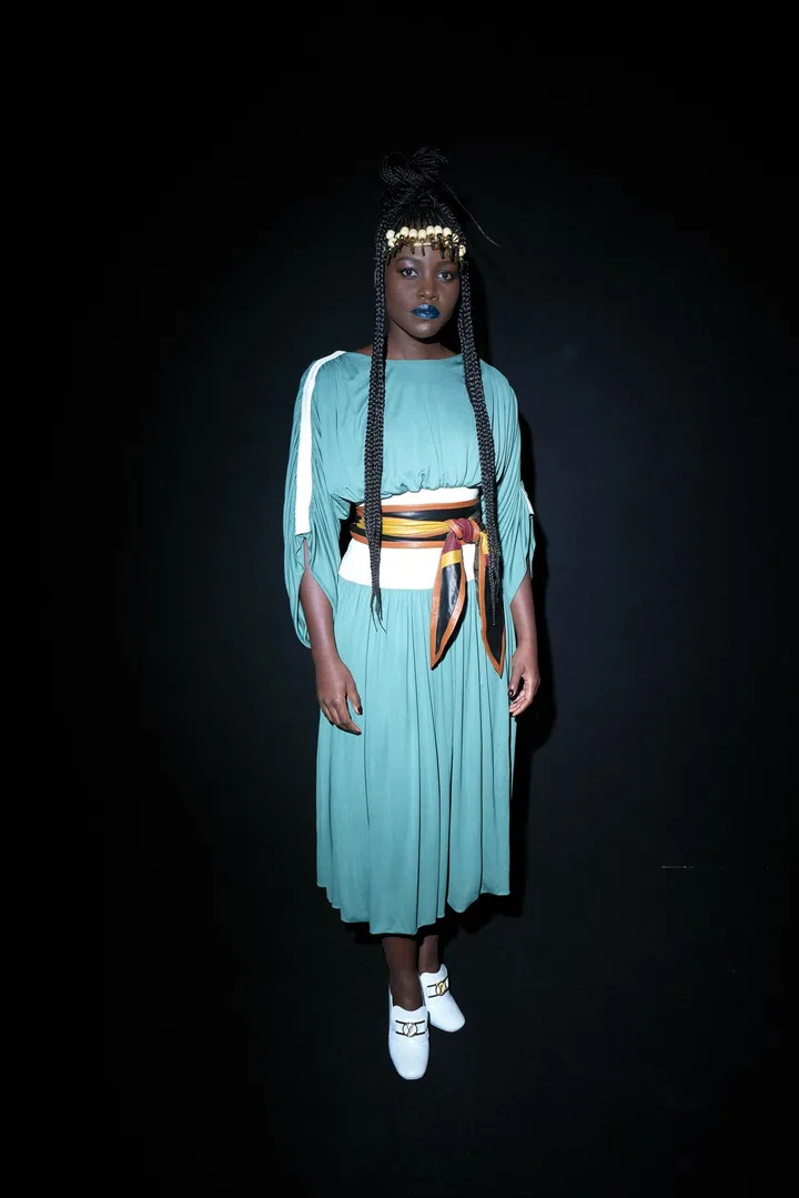 We’re obsessed with this Kenyan-Mexican actress’ outfit as she resembles a contemporary Queen Nefertiti (sans the crown). At Louis Vuitton’s FW ’20 show, Nyong’o wore a baby blue number that was cinched with a thick belt to showcase her waistline. She finished the look with a pair of white heeled loafers.