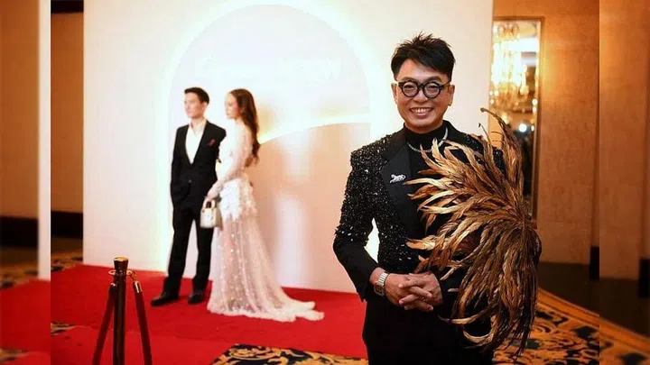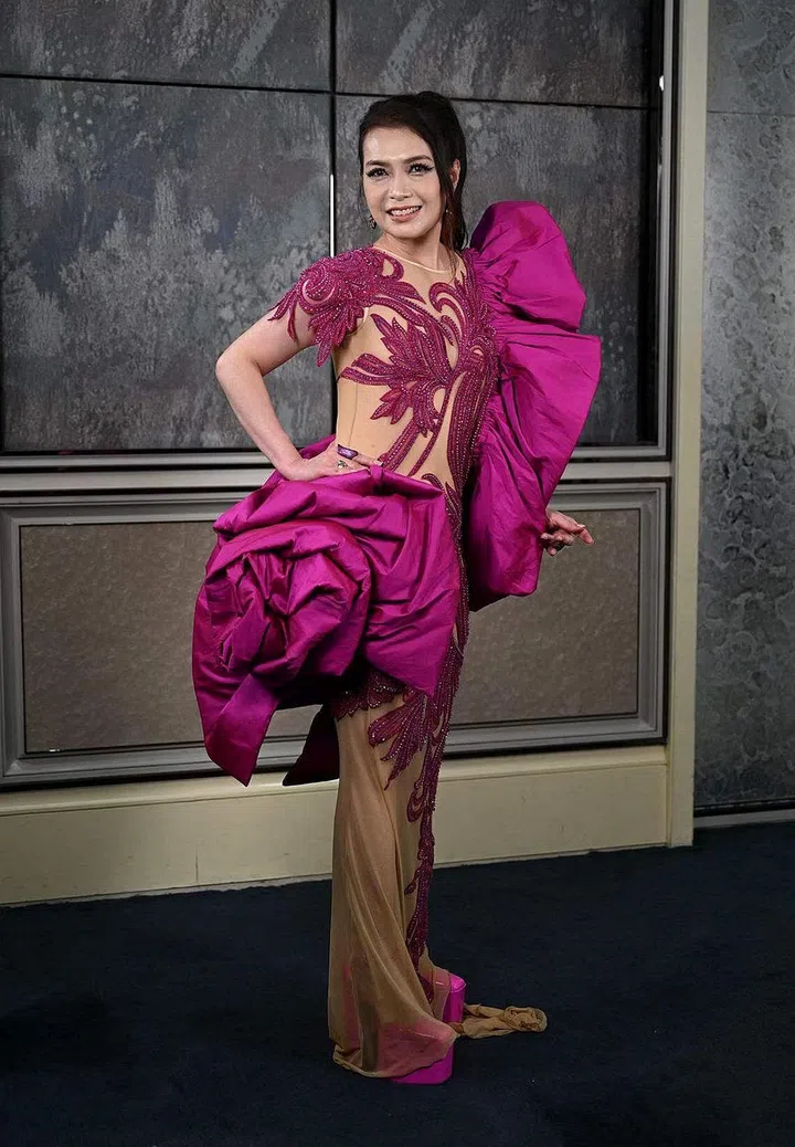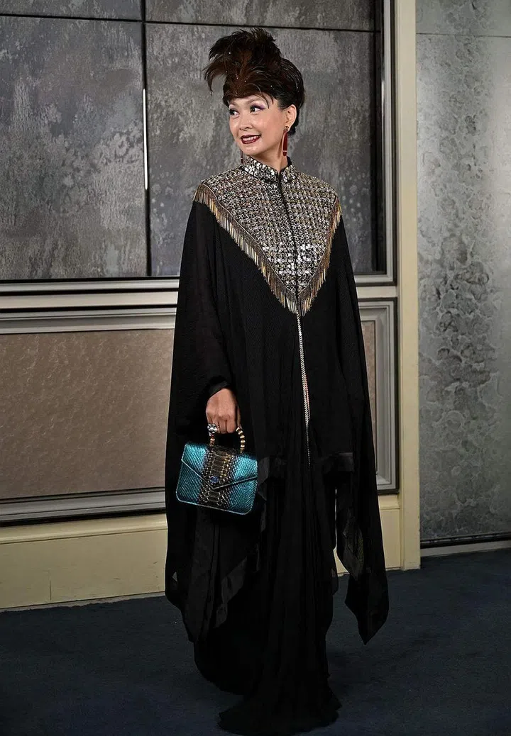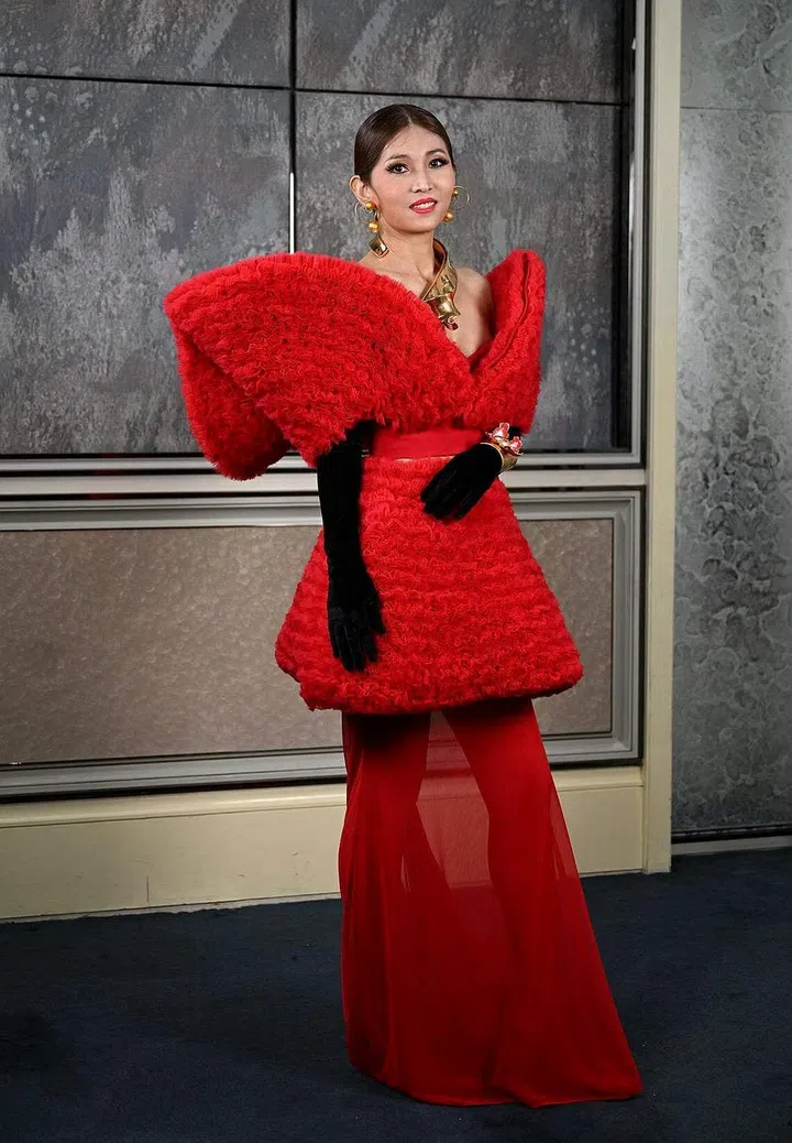 Ms Carol Loo, 41, emerged as a sartorial siren in a striking ensemble by Indonesian designer Harry Halim. The piece, hand-carried to Singapore from Jakarta by her devoted husband, appeared to be a stunning gown in the front, but revealed itself to be practical trousers when viewed from the back.