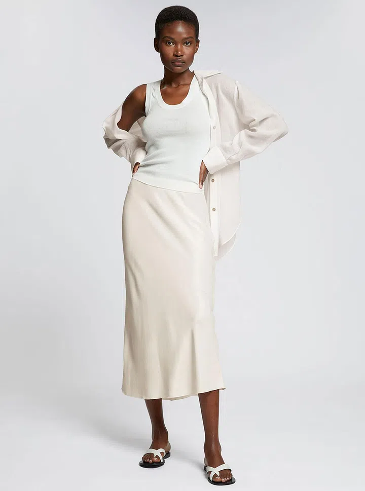 Silk and satin skirts are making a comeback. Perfect for the warmer days ahead, this particular silhouette is a great addition if you’re looking for something a little more feminine. Pair it with an understated white tee and a pair of adidas Sambas for a power-casual moment, or breathe new life into your office wardrobe by styling it with your go-to blazer and pumps.