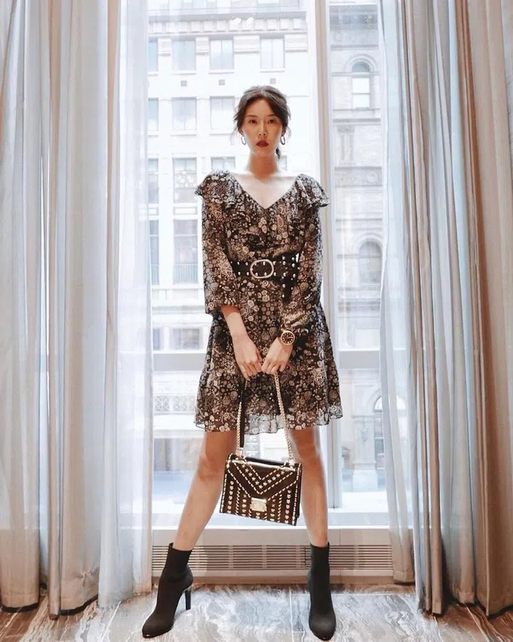 Under the invitation of Michael Kors, Carrie attended the 2018 fashion show in New York dressed in the brand's floral design and studded Whitney purse, looking both sweet and edgy.
