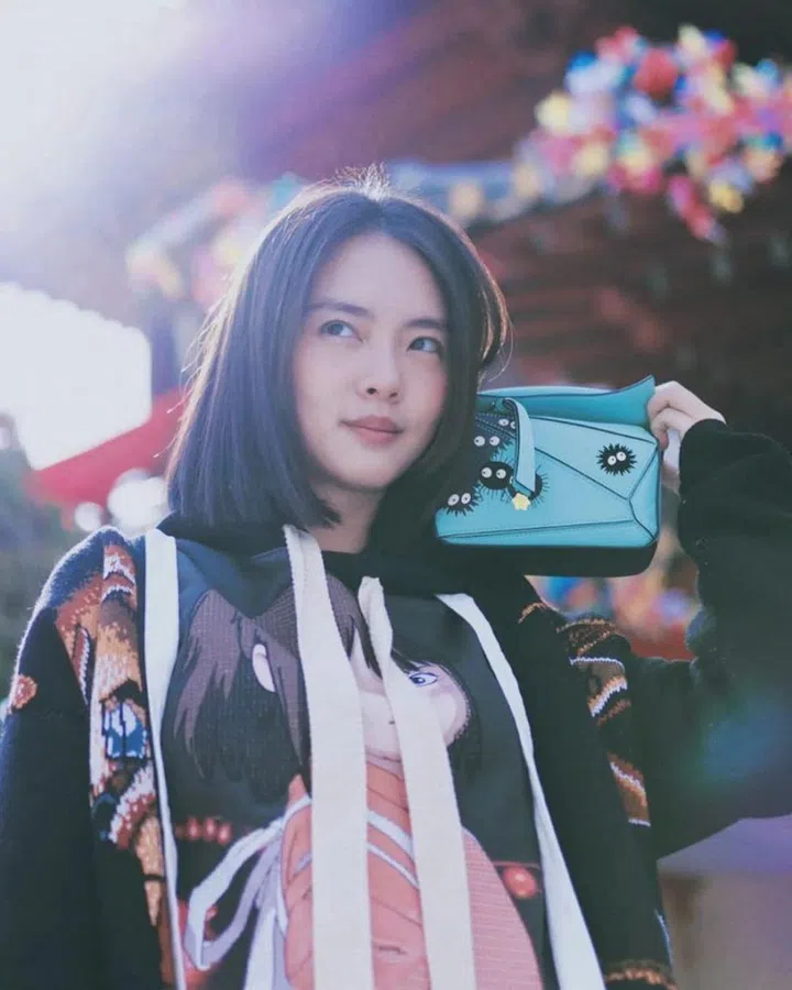 After the hugely successful collab between Loewe and My Neighbour Totoro in 2021, the brand has once again partnered with Studio Ghibli's Spirited Away for a capsule collection. The Puzzle bag Chantalle is holding is adorned with the adorable Susuwatari soot spirits from the movie.