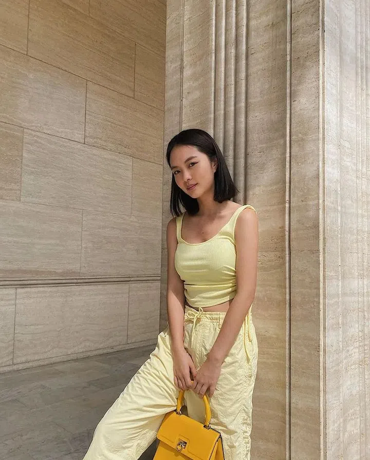 Chantalle's comfy monochromatic look consists of a light yellow tank top and matching drawstring pants accented with a bright yellow Salvatore Ferragamo Trifolio bag. This top handle bag is available in many other colours, and is great for both work and play.