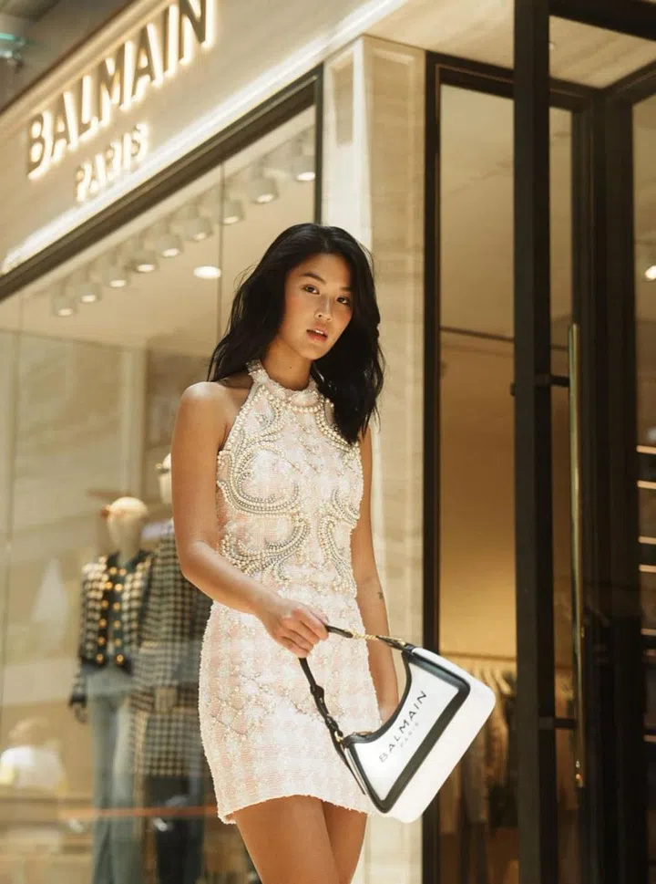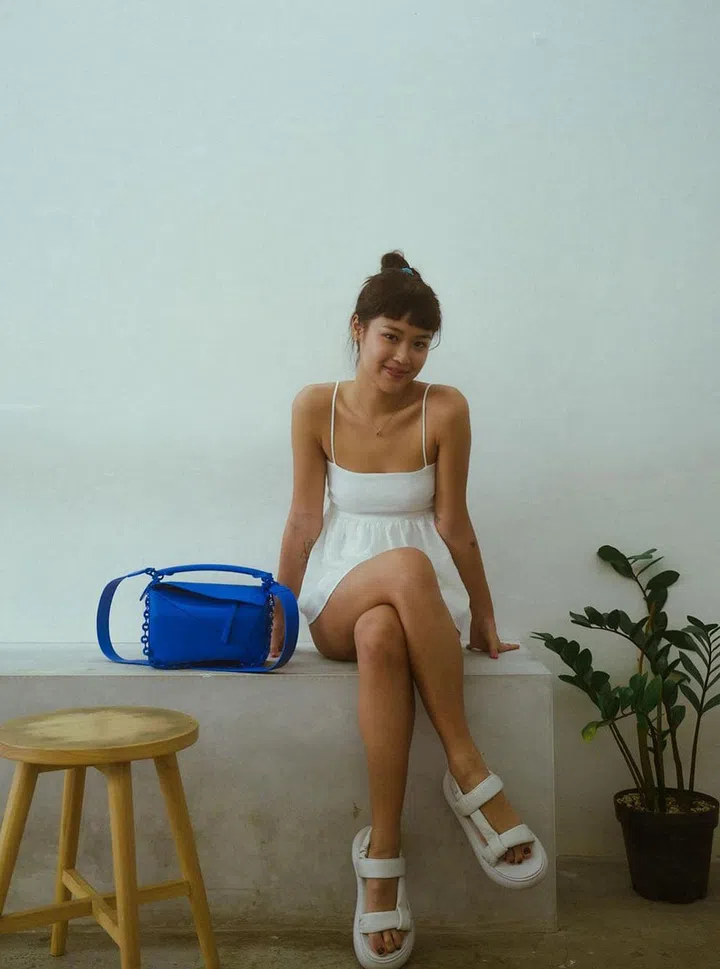 Show off your decolletage with this feminine white babydoll top. Here, Yixin paired her look with matching white sandals and added a pop of colour with a beautiful electric blue bag from Loewe.