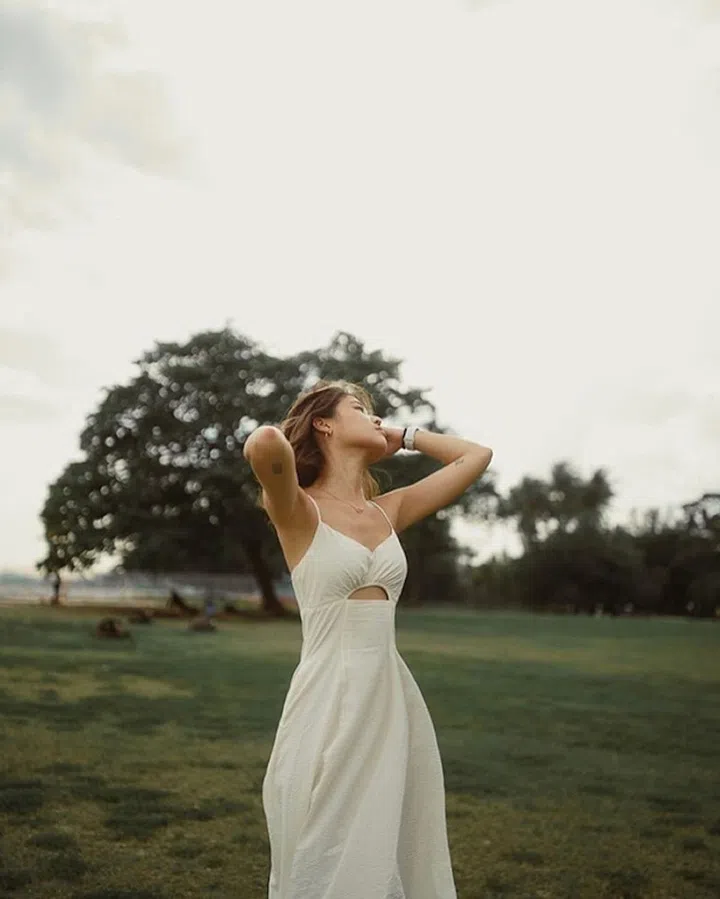 Chen Yixin often sports a white slip dress that allows her to exude a refreshing yet casual elegance. You can also occasionally pick a dress that has details such as cut-outs or back-revealing designs to show off a little skin.