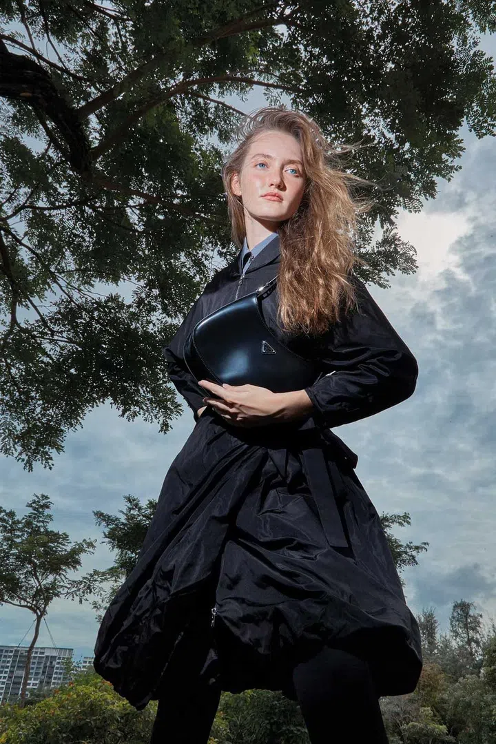 Nylon zip-up dress, nylon shirt (worn underneath), cotton leggings, and leather bag, Prada