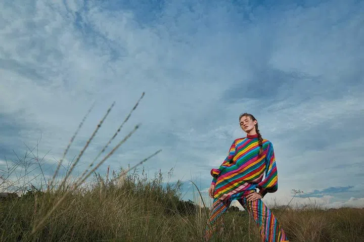 Alessandro Michele put the spotlight on the Italian brand’s heyday from the ’70s with this rainbow tunic and flared pants.
