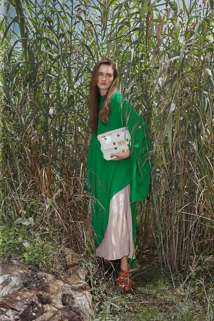Georgette top, georgette plisse skirt, Roman Stud bag, and leather Atelier sandals, Valentino and Valentino Garavani