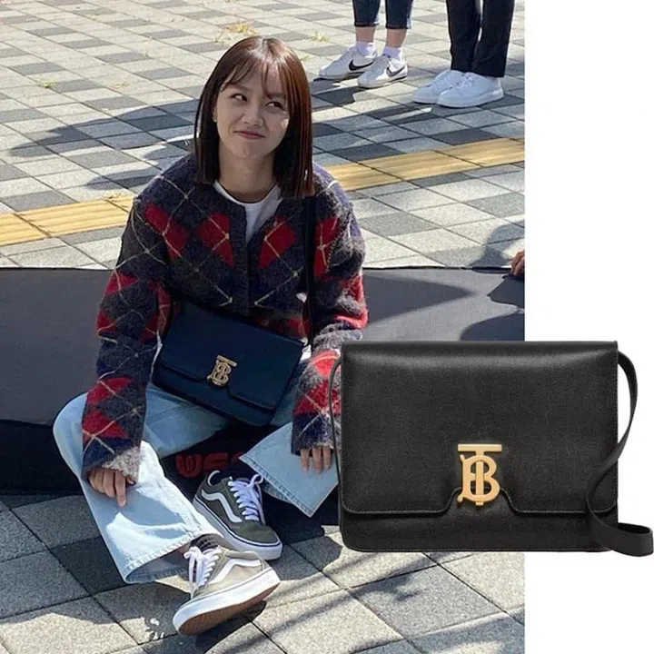 In My Roommate Is A Gumiho, Hye-ri's style leans towards a preppy, collegiate look. This diamond-patterned cardigan and jeans are matched with an angular Burberry TB bag.