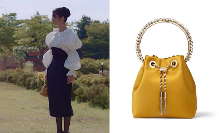 Seo's character has a penchant for dressing in a showy, statement-making way. Take this black and white ensemble, for example, the poufy sleeves add drama and pizzazz while the gold Jimmy Choo accents the look further with its colour and crystal-embellished handle.