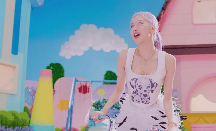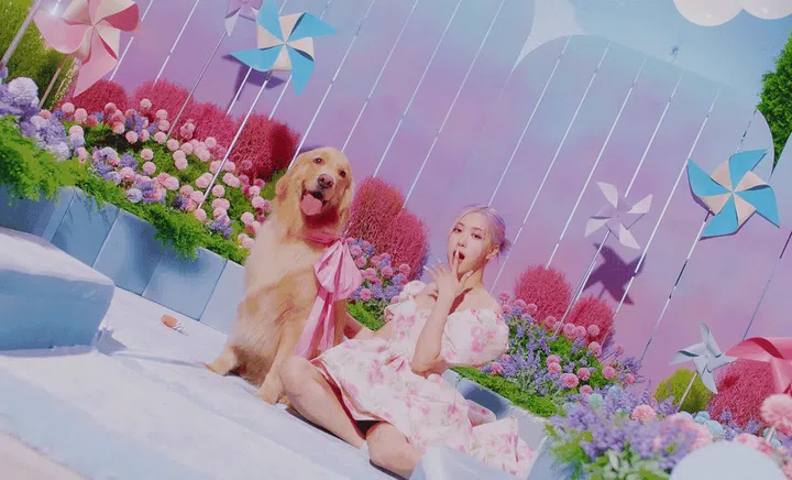 You may have noticed that besides ice cream and candy elements, there were also many cute animals who made their appearance in the music video. For instant, one moment Rosé was in a Dalmation-print top, and in the very next scene, she is playing with an adorable dog in the garden while dressed in a Moschino FW'2020 floral dress.