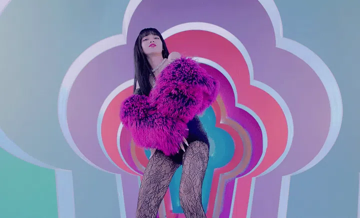 When Lisa is rapping, she is full of swag in her purple fur coat from Area’s FW’19 collection, hot pants and lace stockings which give her a glamorous rock chick vibe.
