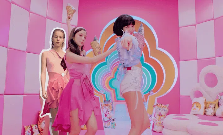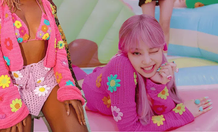 Towards the end of the video, the Blackpink members get dressed up in striking crochet outfits from UK independent brand Fluffy. Jennie, who looks sweet in a pink cardigan here, even got pink hair to complete her look!