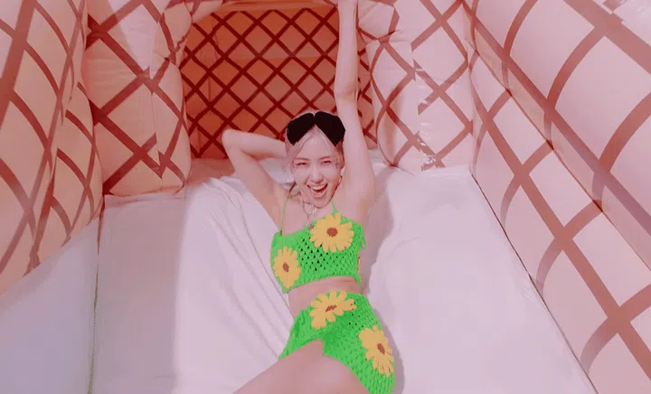 In the ending scenes, the members are having a blast driving their pink mini cars and Rosé, who is dressed in a sexy red Dyspnea sequin bodice and a black and red checkered skirt from Alessandra Rich looks just the part of a race car driver with attitude.