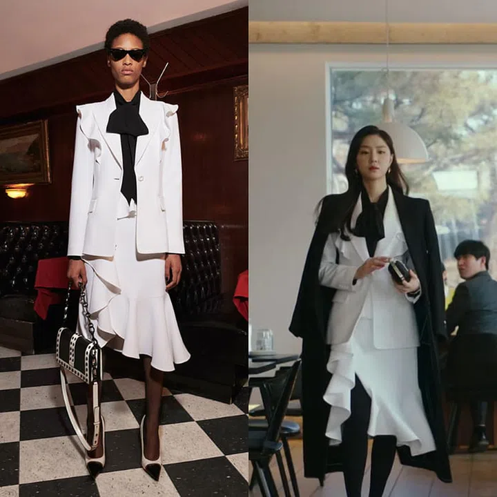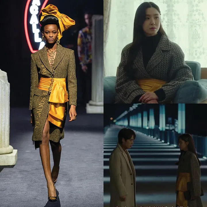 In a flashback scene, it was revealed that Seo and Son had an encounter in a Swiss shop. Then, Seo was in a youthful get-up of an Alexander McQueen 2019 Pre-Spring coat with jeans.