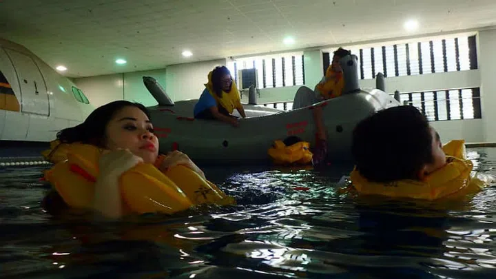The body-hugging sarong kebaya might look uncomfortable, but in times of emergency when mobility is a concern, you can actually tie up the skirt to allow ease of movement. There is a slit in the front of the skirt, and stewardesses can hold the two corners of the fabric, bring it up to their waist and tie it so that the skirt is shorter.