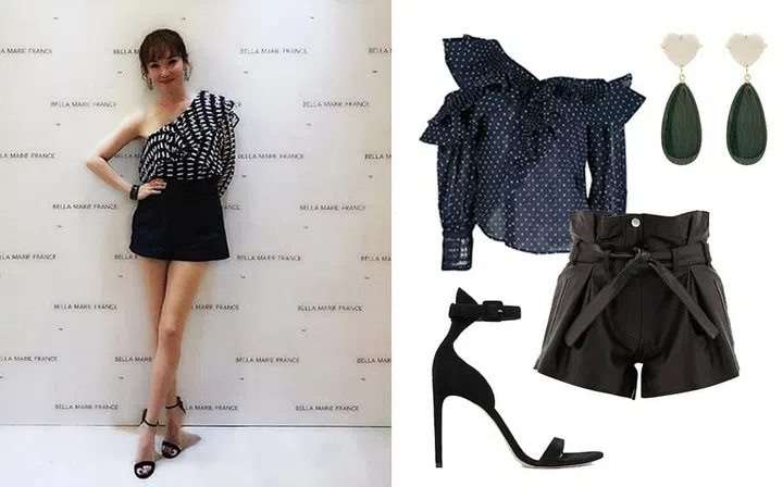 Tucking an asymmetrical one-shoulder ruffled top into a black mini skirt, Fann showed us how to do party dressing the classy way. We’re mimicking this look with Self-Portrait’s ruffled blouse with little white butterfly prints and a pair of high-waisted pleather shorts. To finish the look, throw on a pair of statement dangling earrings in a striking colour – such as this pair of white and emerald green malachite earrings and a pair of ankle-strap stilettos to give the illusion of legs for days.