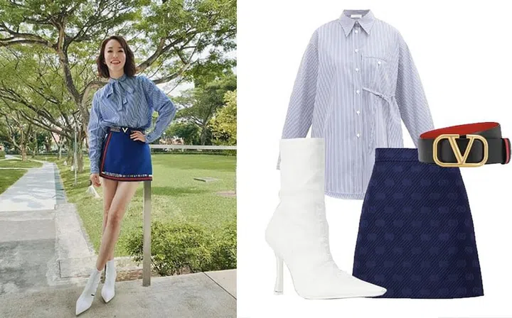 Fann Wong takes on a preppy nautical look with a blue pinstripe blouse with a pussybow and a blue mini skirt lined with red piping for a sporty spin. She finished the look with a pair of white pointed toe boots. To emulate this look, we’ve picked out this crisp blue striped collared shirt to team with a dark blue A-line skirt. Cinch the waist with a Valentino belt, just as Fann did, and slip into this pair of white Alexander Wang boots.