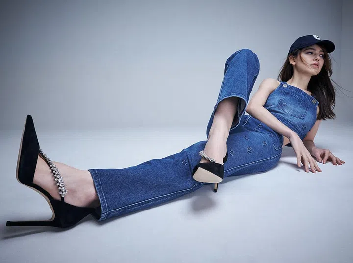 Denim crop top, and matching slim-fit jeans, Chanel. Cotton cap, Celine. Embellished satin pumps, Jimmy Choo.