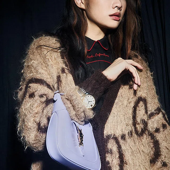 Featured: Leather Jackie 1961 mini hobo bag. Brushed mohair GG jacquard reversible cardigan. Washed vintage cotton shirtdress with embroidery. G-Timeless watch.