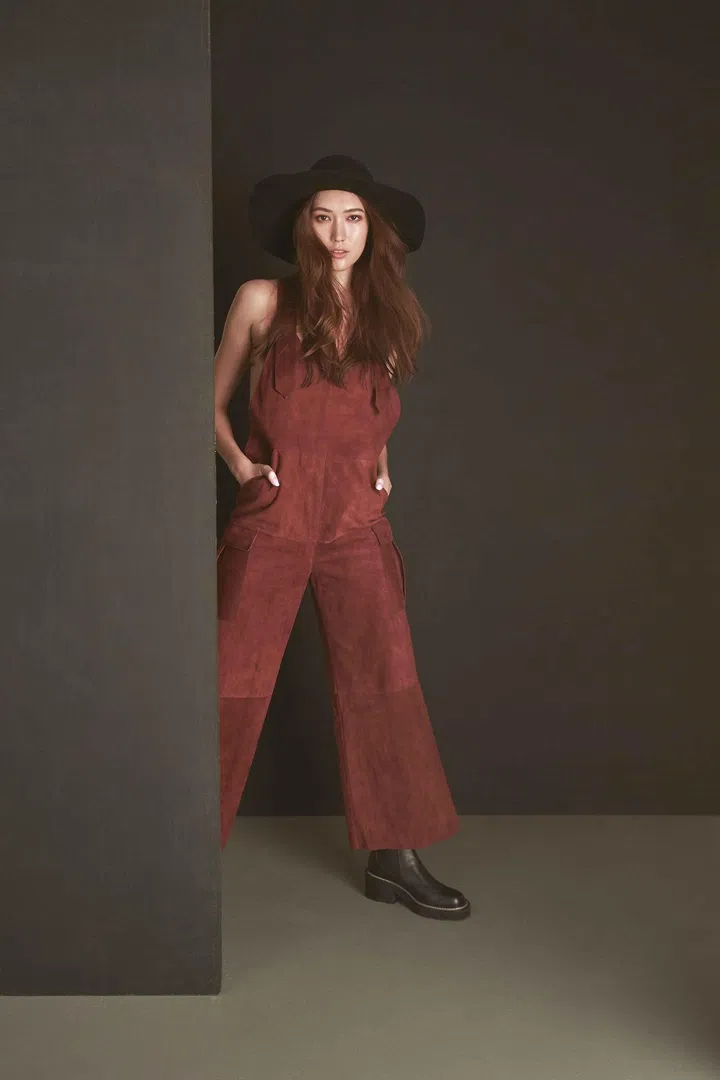 Velvet lambskin leather jumpsuit, $2,755, Longchamp. Felt hat, $1,050, Celine. Leather booties, $2,080, Louis Vuitton