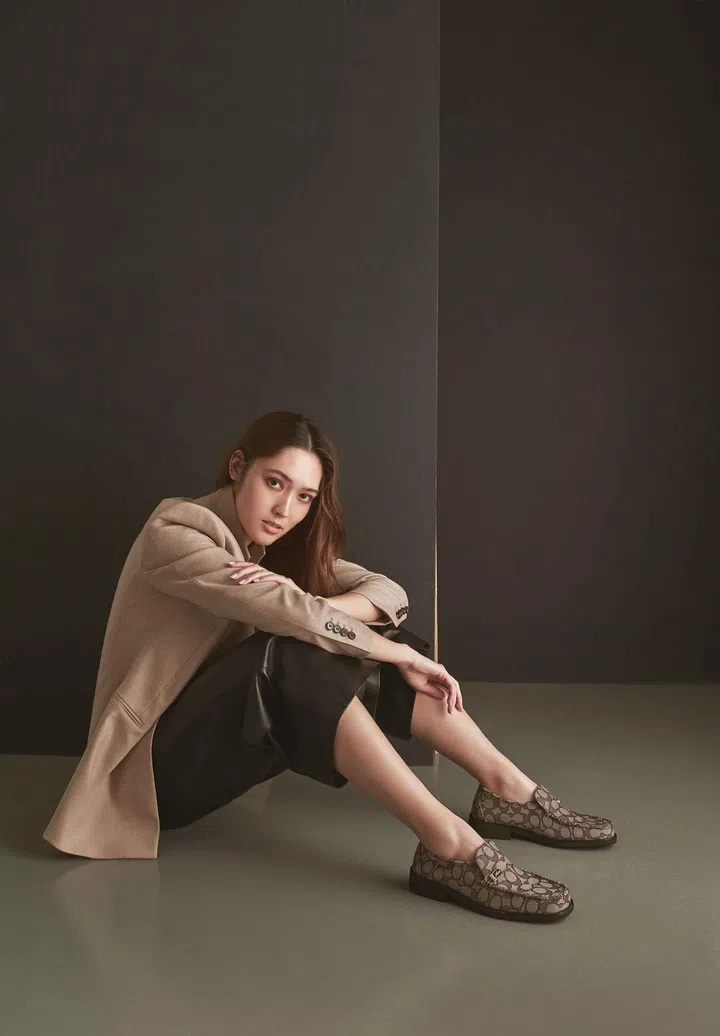 Wool suit jacket, $1,099, Boss. Lambskin leather culottes, $2,025, Longchamp. Canvas and leather loafers, Coach