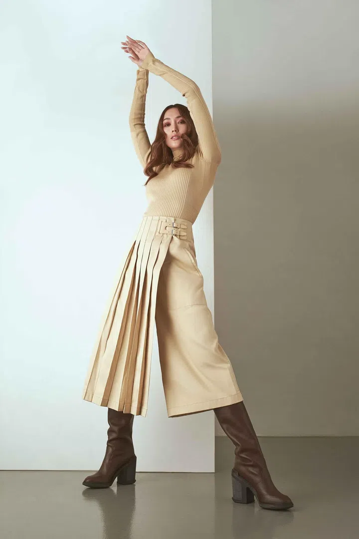 Cashmere knit turtleneck, cotton and leather pleated culottes, and leather boots, $3,250, Hermes