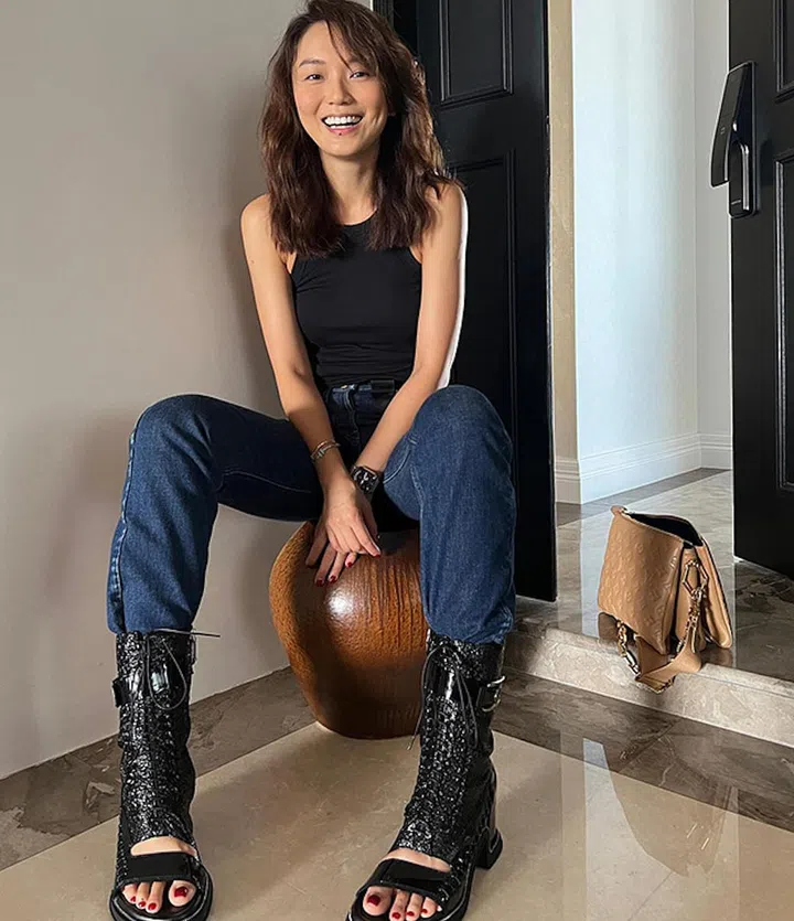 If you're ever looking for a pair of boots that can be worn comfortably in Singapore, try the Louis Vuitton Moonlight half boot seen on Joanne Peh here. She went for a casual streetwear look with jeans and a tank top that revealed her shoulders.