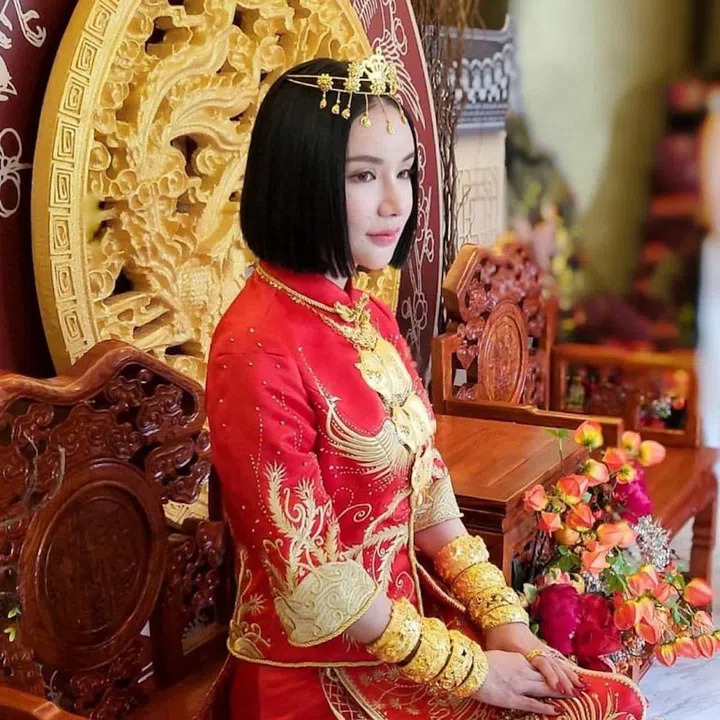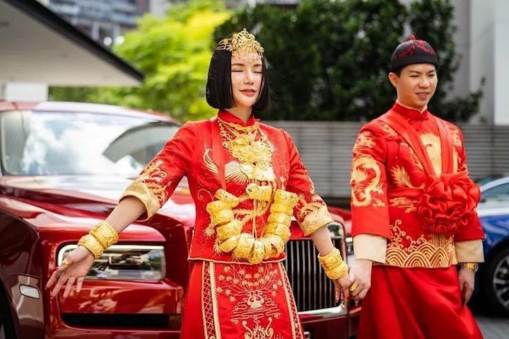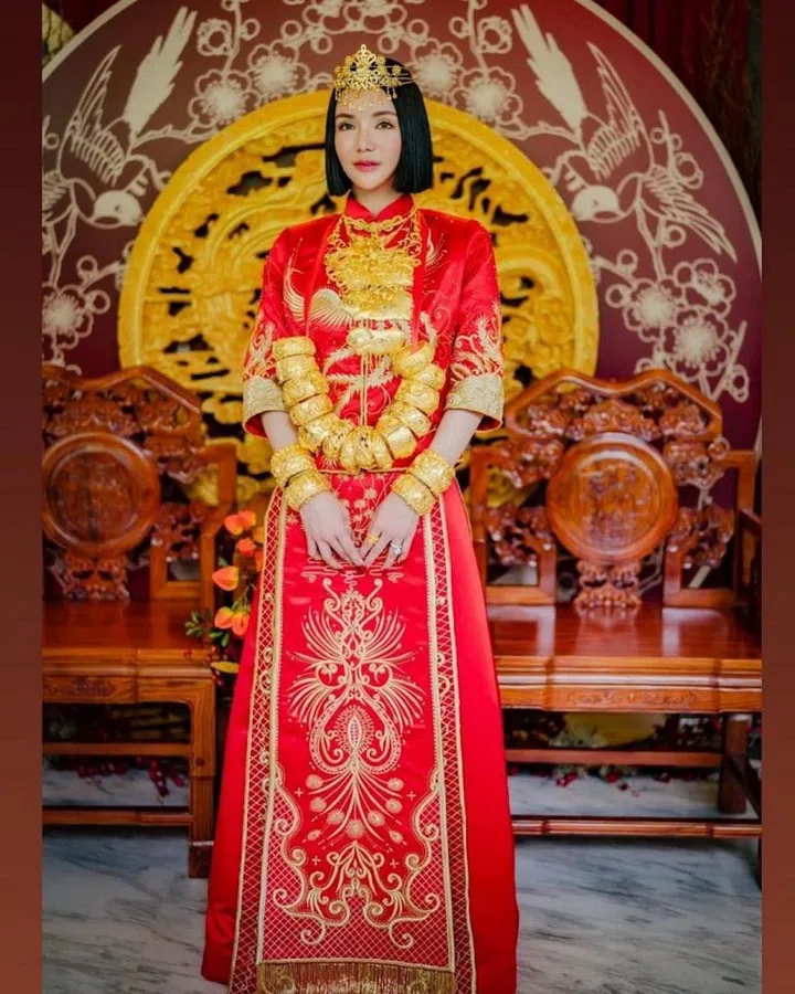 Although western-style wedding dresses have become all the rage, Kim Lim hasn't abandoned the traditional Chinese wedding dress, the qun kwa. Custom-made by byGesa Couture, this qun kwa was also worn on the day of solemnisation. The striking red outfit is adorned with dragon and phoenix motifs, and matched with a huge necklace and seven pairs of dragon and phoenix bracelets.