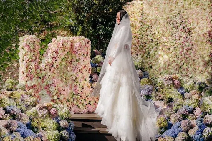 During her solemnisation ceremony on February 22, Kim Lim wore a two-piece style wedding dress from Chosen By Kyha, which is carried by local boutique The Ivory Bridal. The crop top features simple, sleek lines that contrast with the voluminous, layered chiffon skirt.
