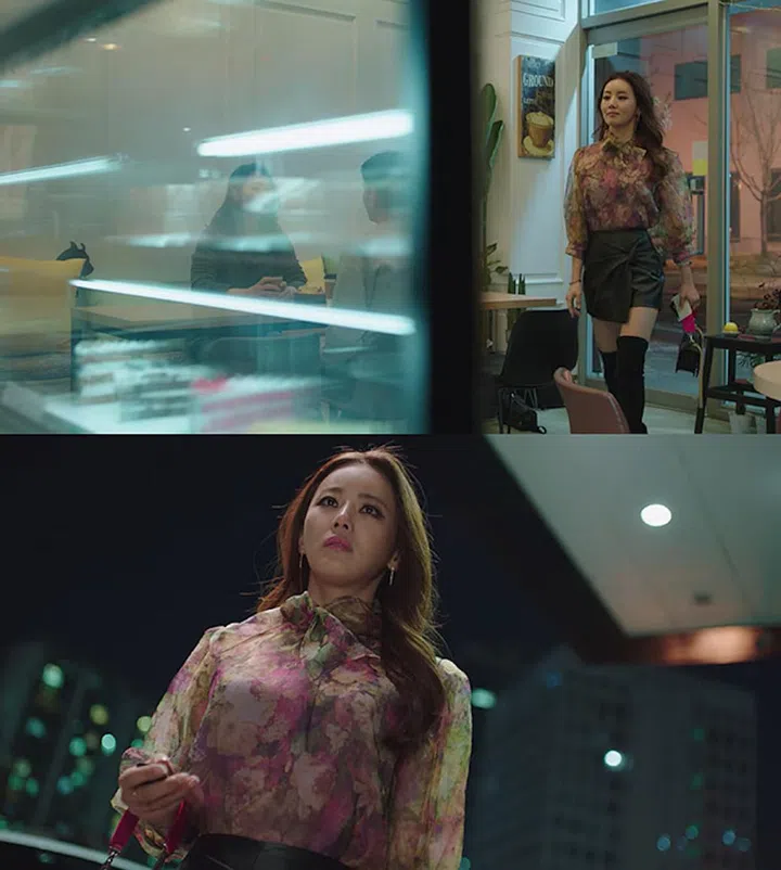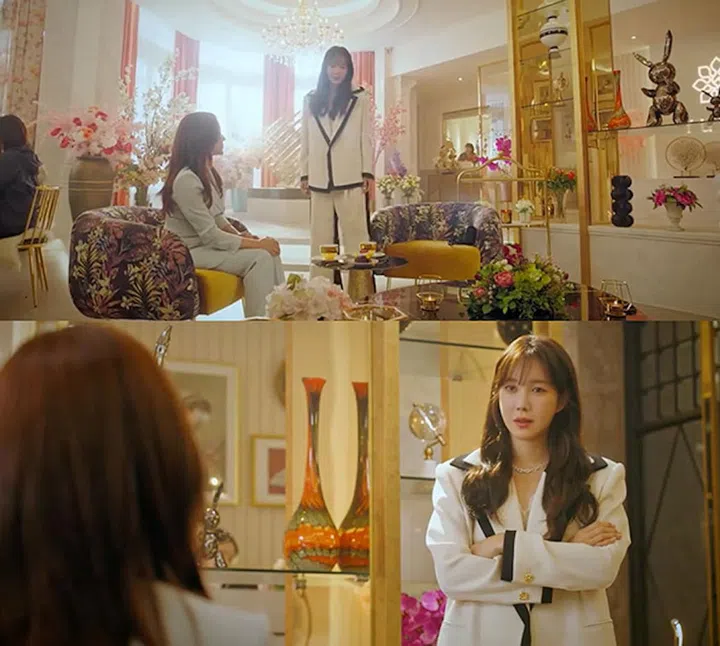 In the show, Lee Ji-ah plays Shim Su-ryeon who lives in the penthouse of Hera Palace. Her delicate and elegant style can be seen in this get-up consisting of a Zadig & Voltaire silk top, EENK oversized blazer and trousers set as well as a Fred Force 10 necklace. It looks like the unique silhouette exemplifies her power and charisma.