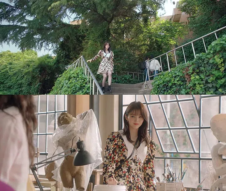 Han So-hee's outfits in the show are simple and unpretentious. This scene shows her in a floral Miu Miu dress that looks retro but has a modern silhouette together with a shoulder bag from the Korean bag label Joy Gryson.