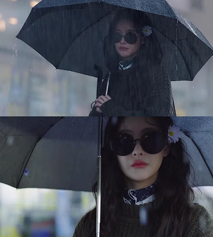 Oh Yeon-seo plays Lee Min-kyung who suffers from post-traumatic stress disorder. To make people avoid her, she dresses up in unique manners by wearing a pair of sunglasses and has a stalk of flower by her ear to mask her inner unease. In the first episode, she wore an oversized knit pullover, and has a dark silk scarf wrapped around her neck. This layered look, combined with the round sunglasses, exemplifies her unique sense of style.