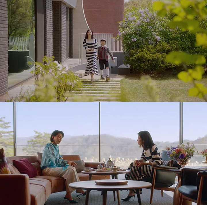 Lee Bo-young, who played second daughter-in-law Seo Hi-soo, wore many bright colours in the show. Here, she wears a striped square-neck knit dress from Alexander McQueen with a leather belt. The clean lines and silhouette showed off her character's wealthy elegance while highlighting her toned physique.