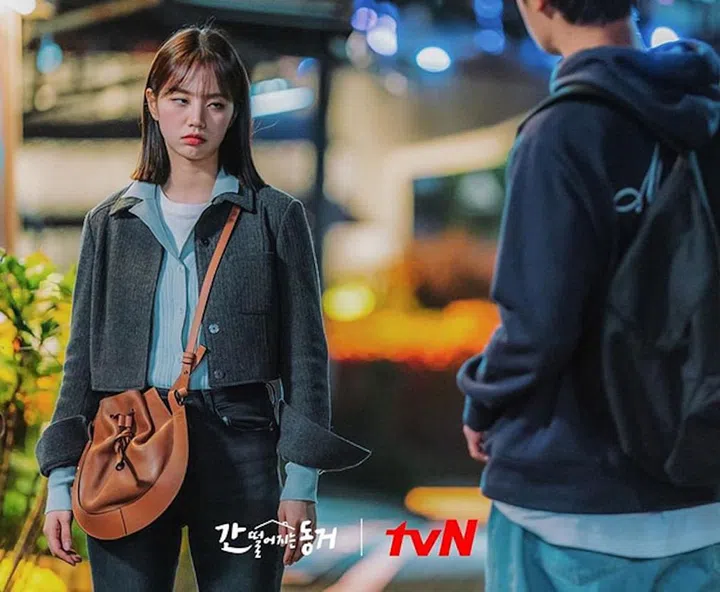Hye-ri's styling in the show is easy to recreate in real life. Among the looks, our favourite is this three-piece set consisting of a shirt, a knitted sweater and a cropped jacket. This layered outfit doesn't look heavy while the upturned sleeves and collar add dimension. Paired with the evergreen jeans and brown shoulder bag, the overall look is stylish and easy to accomplish.