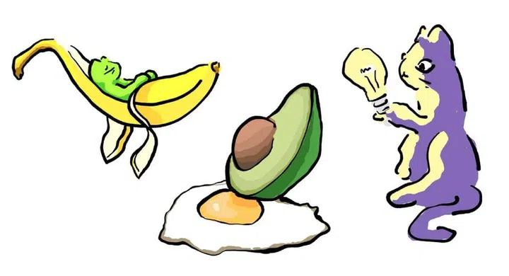 This includes a cat dozing off in a banana peel, an avocado meeting an egg, a cat holding a light bulb — showcasing Fischer's artistic and creative calibre. The series of characters are also united by the whimsical print and will be added to a colorful silk square.