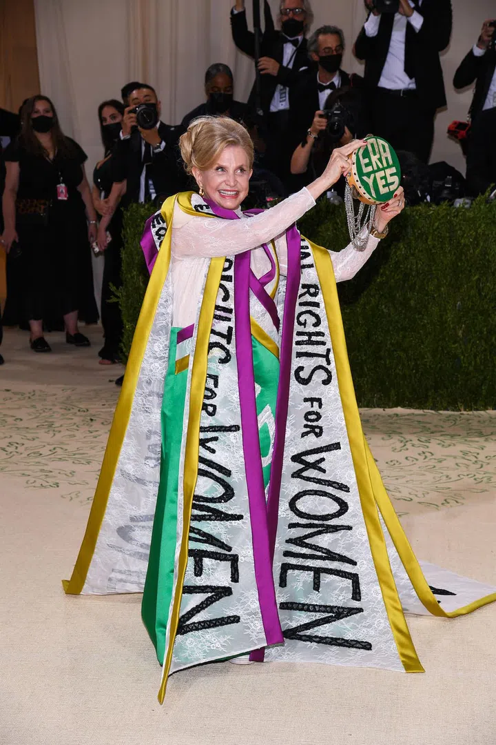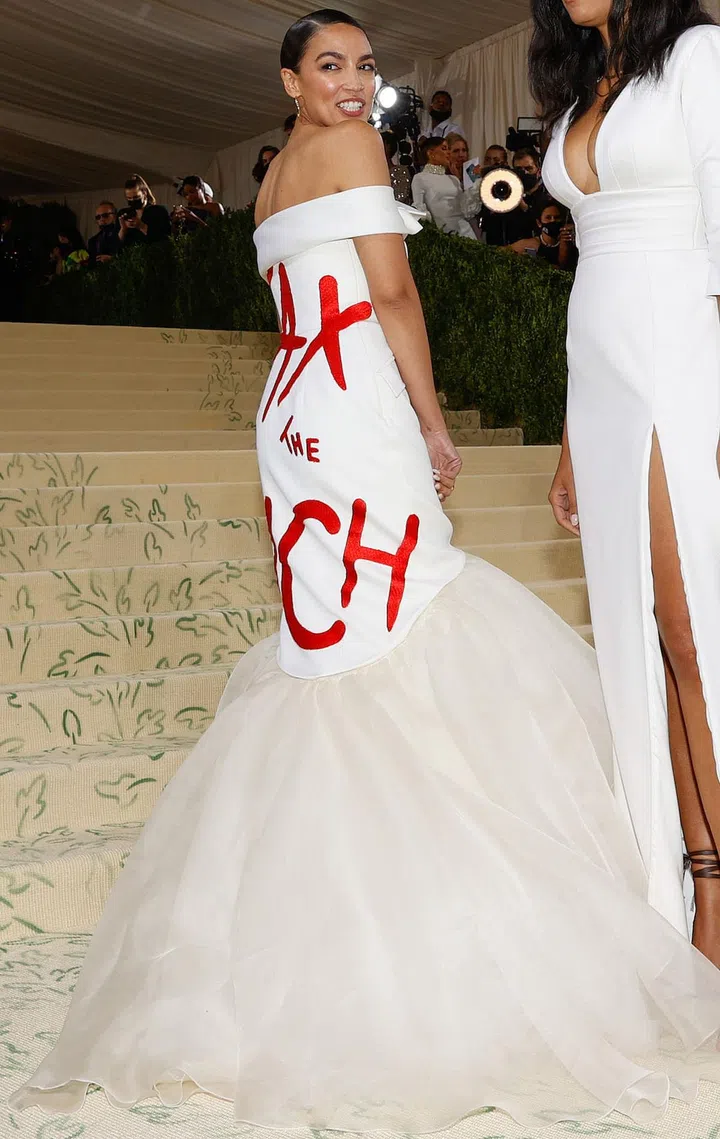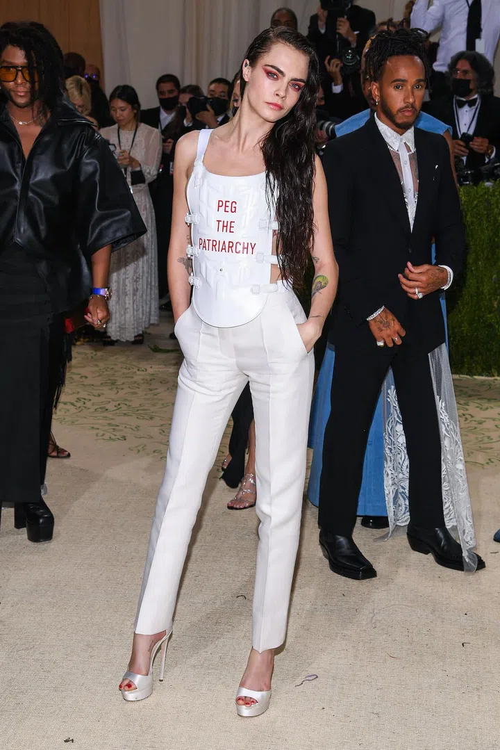 The Gen Z singer wasn't the only one who used the platform to push for political causes they believed in. Model Cara Delevingne fought for women empowerment with a Christian Dior outfit that read "Peg the Patriarchy" while Dutch YouTuber Nikki de Jager (NikkieTutorials), who came out as transgender last year, wore an outfit inspired by the late trans activist Marsha P. Johnson. Congresswomen Alexandria Ocasio-Cortez wants to "Tax the Rich" with her white Brother Vellies dress and Carolyn B. Maloney pushed for "Equal Rights For Women". Rapper Saweetie celebrated her Filipino and Black American lineage by including the colours into her crystal Christian Cowan gown.