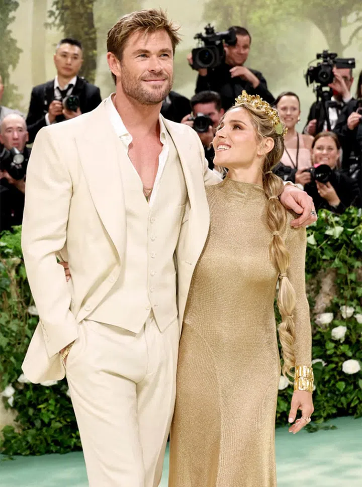 Dressed in a custom Tom Ford three-piece cream suit and gold gown respectively, co-chair Chris Hemsworth was a dashing knight to his Rapunzel-esque wife, Elsa Pataky, who completed her look with a gilded headpiece.