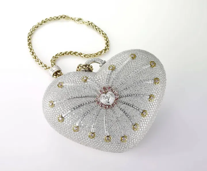 It comprises 4,517 diamonds — 105 yellow, 56 pink and 4,356 colourless — and took a total of 8,800 hours to be crafted.