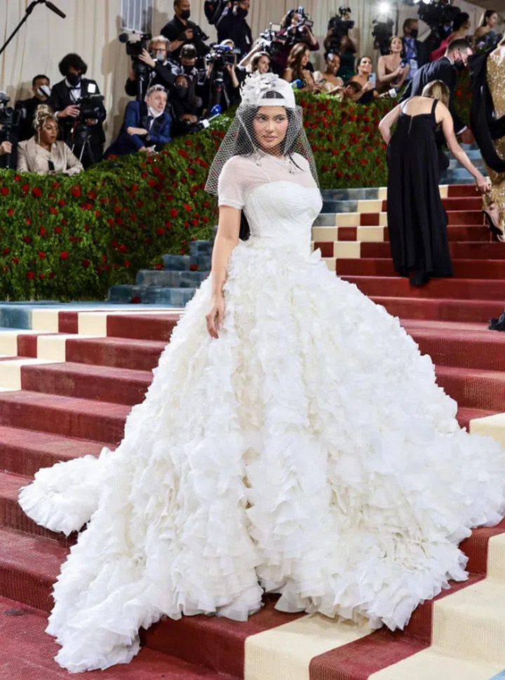 The billionaire of the Kardashian-Jenner clan took to the 2022 Met Gala in an ethereal all-white gown complete with a romantically draped bodice and full ruffled skirt with a bridal veil by luxury streetwear label Off-White. The look was also completed with a baseball cap. If any bride needs inspiration on what to wear to a wedding on the sports field, look no further.
