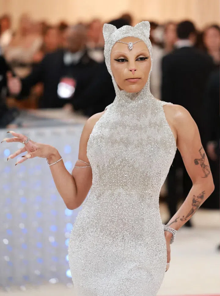 There are many ways to unravel a dress code that nods to Karl Lagerfeld. Inspiration can span from his unwavering uniform of black and white, to his gargantuan body of work through the years. But for the ‘Kiss Me More’ singer, she made like her namesake, referenced the designer’s beloved feline Choupette, and appeared as a human cat dressed in Oscar de la Renta instead.