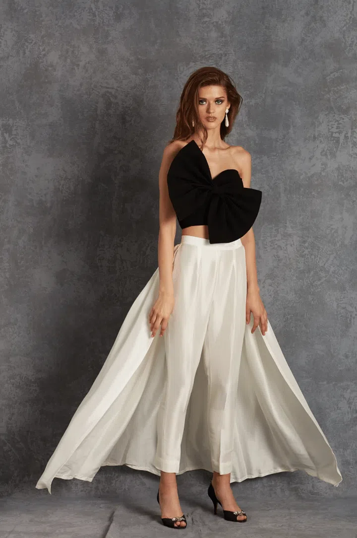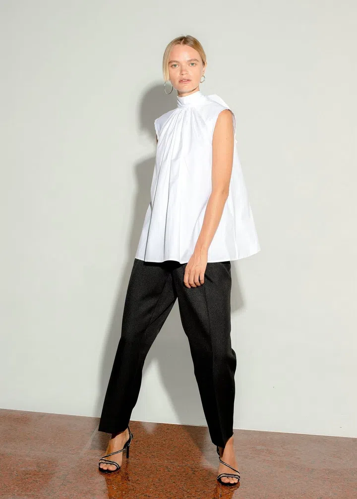 “The first off-shoulder piece that I introduced was a white top that had a big voluminous bishop sleeve attached to it. The second version of this design, which is more structural with a peplum detail and a shoulder pad, was very popular too. Both of them are sold out now,” she concludes happily.