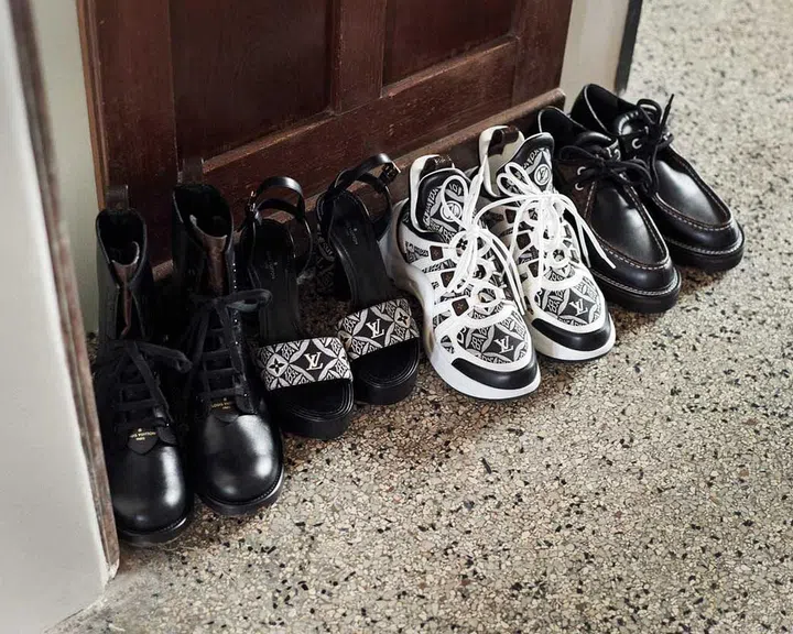 Metropolis boots, $2,240, Podium sandals, $1,630, LV Archlight sneakers, $1,770, and Beauborg shoes, $1,750