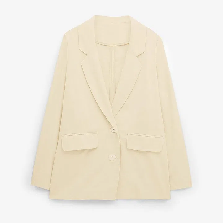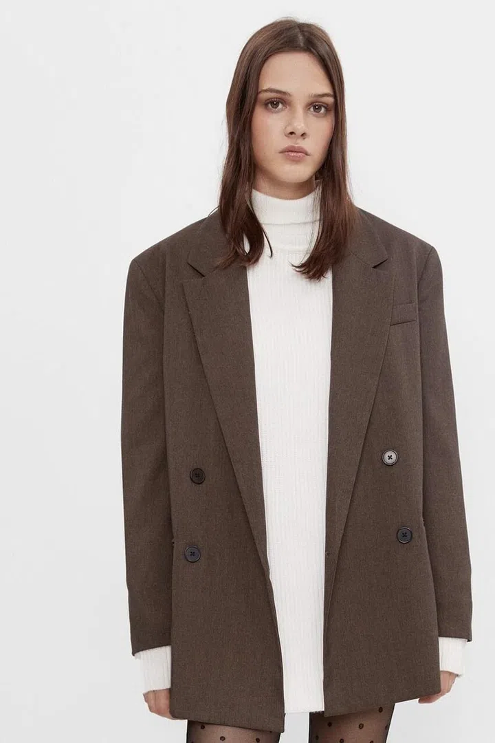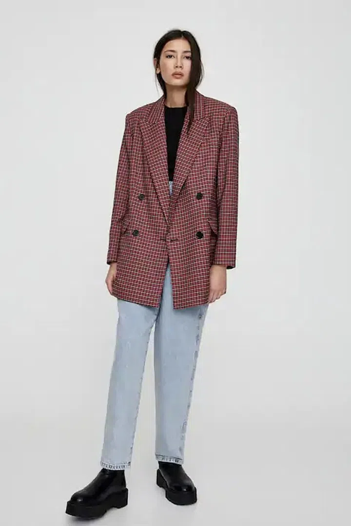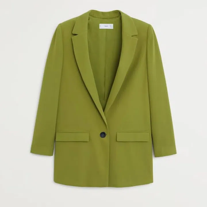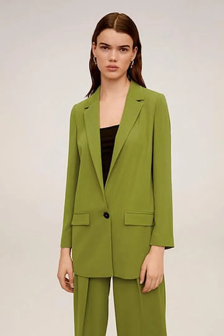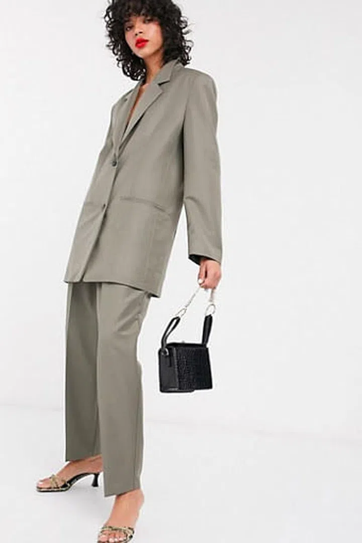 If you like your oversized blazers with a slightly more polished look featuring clean lines, look no further than this number. Rendered in a lovely shade of olive green that’s befitting of the fall season, this blazer from Mango is cut to a straight slim-fit silhouette, and features crisp and sharp tailoring. Style it unbuttoned over a beige ribbed knit top tucked into a pair of high-waisted relaxed-fit trousers.
