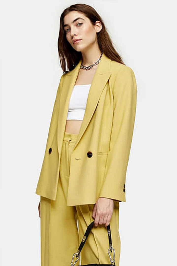 Add a unique pop of colour into your workwear capsule closet. Not only is this lime green blazer perfectly on trend in its colourway, it’s also sharp and smart with its sophisticated tailoring and structured silhouette. Complement it with a printed bias cut skirt, a plain white tee, and a pair of pointed toe mules.