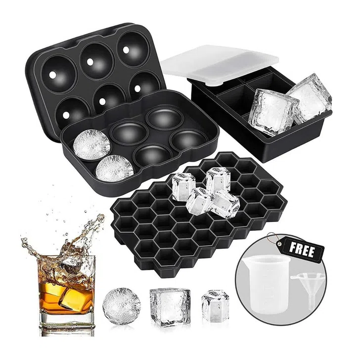 This set of three ice trays contains everything needed to make any variety of iced drinks and frozen desserts, from whiskey, cocktails and iced fruit tea to fruit popsicles or jelly. Every silicone ice tray is BPA -free, non-toxic and odourless.  You'll get a tray that makes six large round ice balls, another for six large square ice cubes, and a final tray that makes 37 honeycomb ice cubes.